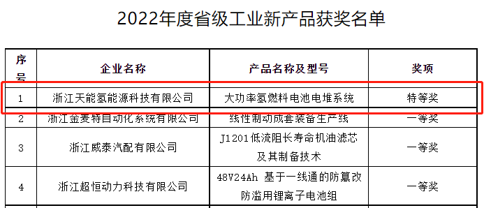 近日,浙江省长兴县经济和信息化局公示了2022年度省级工业新产品获奖名单,由浙江星空官网氢能源科技有限公司研发生产的大功率氢燃料电池电堆系统获得全县唯一省级特等奖。
